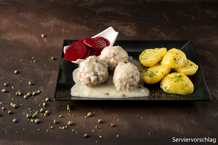 Sie müssen lediglich den Inhalt erhitzen und können die Fleisch-Klopse nach Königsberger Art anschließend direkt auf dem Teller mit Ihren gewünschten Beilagen anrichten. Das Auge isst schließlich mit!
