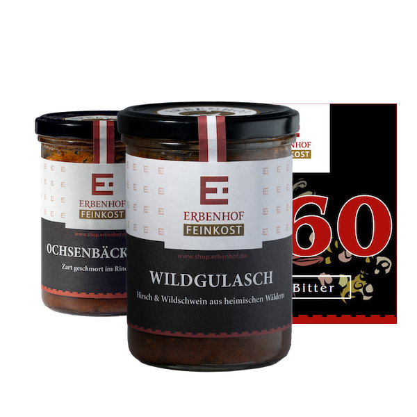 Eines unserer Geheimnisse liegt in der Auswahl der Zutaten. Von regionalen Produzenten wird auf kürzestem Wege das Wild und Rind in unsere Restaurantküche geliefert. Somit sorgen unsere gelobten Restaurantköche dafür, dass Sie hochwertige Spezialitäten erhalten. Unser Wildgulasch sowie das Ochsenbäckchen werden individuell gekocht und nach Erbenhof Art verfeinert. Nach der Zubereitung werden die Gerichte behutsam in die Gläser gefüllt und sorgsam verschlossen. So gelangt das Aroma und der Geschmack aus unserem Weimarer Restaurant direkt zu Ihnen nach Hause.